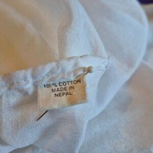 Rarely worn, white 100% cotton, purple trim on collar and purple diamonds on sleeves, v-cut at front bottom, size S, 24" long
