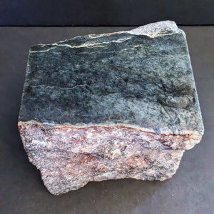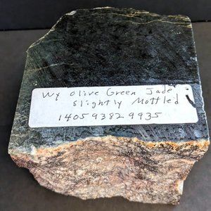 Roughly polished Nephrite Jade block. Dark (almost midnight) Green color with some green mottling. Few light yellow veins. Block weighs approx. 2.2 kg (4.8 lbs) and measures approx. 4x3.5x3.75 inches.