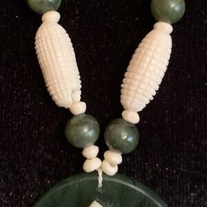 Pre-owned good condition for being vintage. Small chip in nephrite on left edge when looking at and beige corn shape bead has a small piece broken off one.