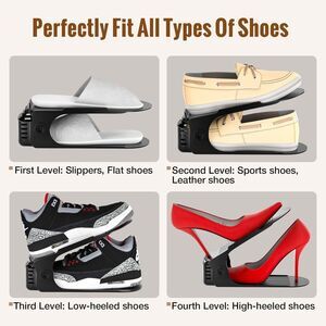 The shoe rack organzier has 4 adjustable height levels, You can adjust from 2.7'', 4.3'',6.4'' to 7.2'' according to the type of shoes, ensure not squeeze, destroy shoes, suitable for most sports shoes, slippers, flat shoes, sandals, high heels and so on.