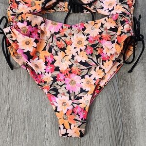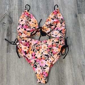Stylish one-piece swimsuit with vibrant floral design. Features a chic cutout and adjustable ties.