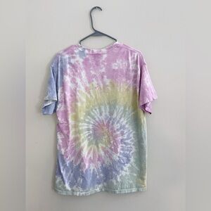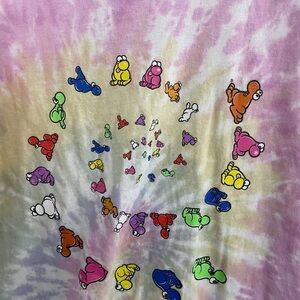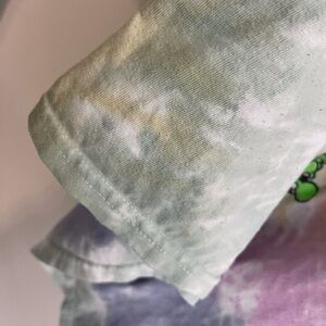 Nerds tie-dye T-shirt with fading and a stain on one sleeve. Shown in the last photo. The measurements are a 38 1/2 to 40 inch bust, 27 1/2 to 28 1/2 inches in length and 40 inches across the bottom of the t-shirt.
