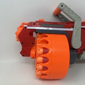 THIS NERF N-STRIKE MEGA MEGALODON BLASTER IS A HIGH-POWERED DART GUN DESIGNED FOR RAPID-FIRE ACTION AND BIG IMPACT. FEATURING A ROTATING DRUM THAT HOLDS UP TO 20 MEGA WHISTLER DARTS, THIS TOY BLASTER DELIVERS FAST-PACED FUN AND IS PERFECT FOR COMPETITIVE PLAY. INCLUDED ARE 18 MEGA DARTS THAT SCREAM THROUGH THE AIR WHEN LAUNCHED, ADDING EXTRA EXCITEMENT TO EVERY SHOT. THE COMPACT, CRANK-ACTION DESIGN MAKES IT EASY TO RELOAD AND FIRE, WHILE THE BOLD RED AND ORANGE COLOR SCHEME STANDS OUT DURING NERF BATTLES.