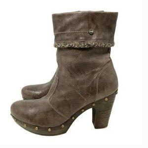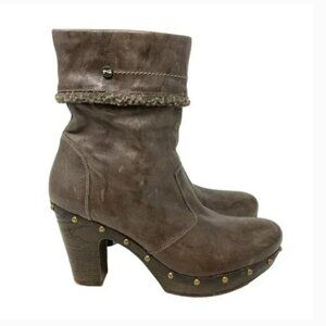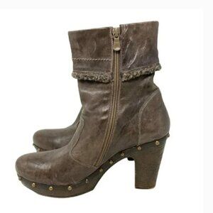 Nero Giardini Italian Brown Distressed Leather Zip Ankle Clog Boots - Size 9.5 (EU 40). Leather upper, lining and insole. Studded embellishment around the outer foot. Full side zipper for easy on and off. Made in Italy.