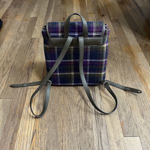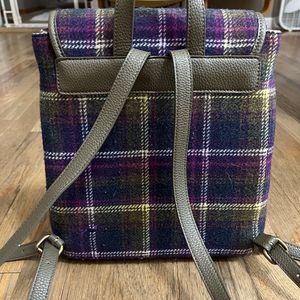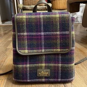 Beautiful vintage backpack / tote / purse from Ness of Scotland Purple and green plaid tartan exterior Interior has deer print in navy and purple on cream. Two slash pockets and one zipper pocket inside. Adjustable straps as shown Approximate size: 11' tall x 14.5" wide at widest point, 5" across side of bottom