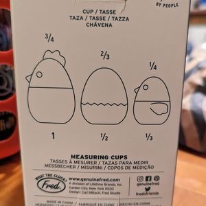 Adorable Chicken/Egg Nested Measuring Cups BNWT, by Genuine Fred. I opened the box, but the measurements are a little hard to read, and I already have 5 different measuring cups, I don't need anymore. I just bought it bc I love chickens. The measurement is written on the inside bottom of the halved piece (see pic).