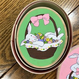 Nesting Easter egg boxes. 3 wooden egg shaped boxes with cute Easter designs.