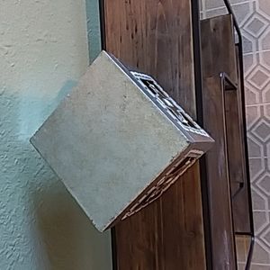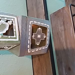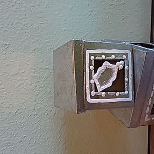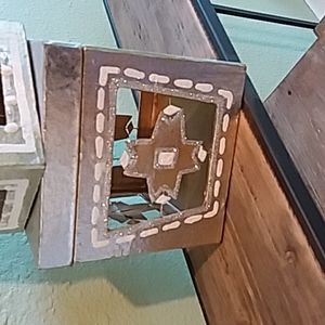 Two silver boxes each with a different ornament attached with a wire to look like it is floating. Decorated around the windows with paint and some glitter. Use together or apart for decoration or a surprise gift for someone special. Large box measures 5" x 5" x 5". Small one measures 4" x 4" x 4".