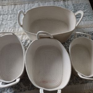 Cream nesting baskets, set of four. All in great condition, however second largest has a faint pint/red stain as shown in picture. Sizes from largest to o smallest 15"L, 11"W and 6"D, smallest is 11"L, 8"W and 4"D.