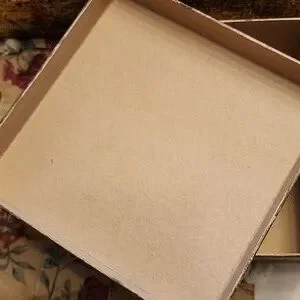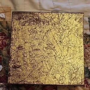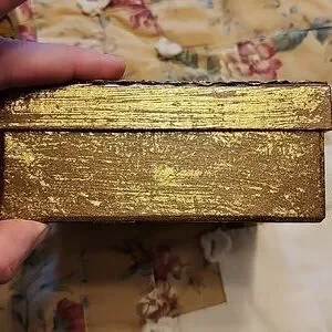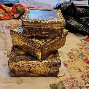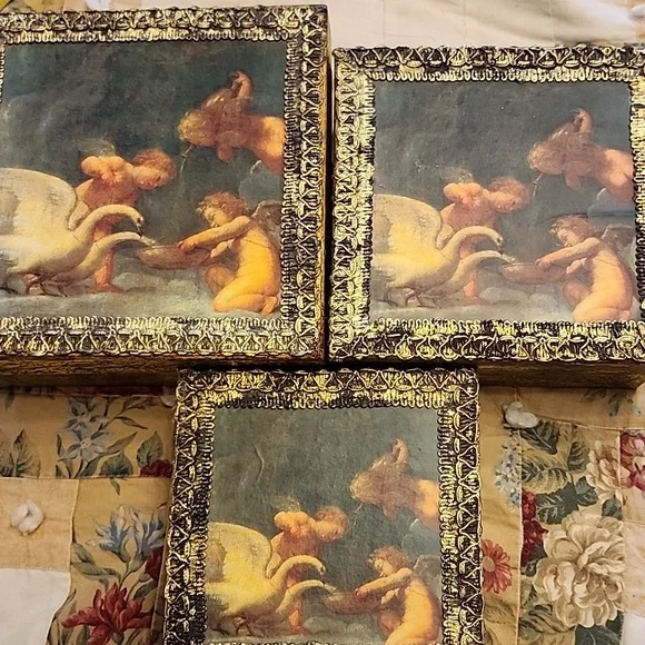 lVery pretty set of nesting boxes. The large is 7" square, medium 6" square and small is 5 1/2 " square. These are made out of thick cardboard, GUC. The color is antique gold trim with cherubs and swans in the picture. Great for a dresser for jewelry, etc. These are very light weight, like less than a pound.
