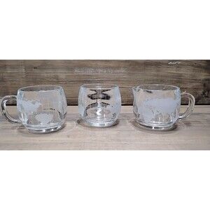 1970's Nestle Nescafe Clear Glass Etched Globe World Coffee Mug-Set Of 4. Complete with mugs, Creamer, Sugar & Spoon