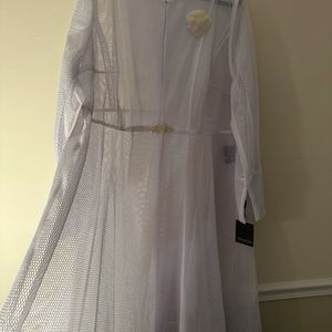 White, net material, light coat with yellow closure and brooch , long sleeve