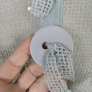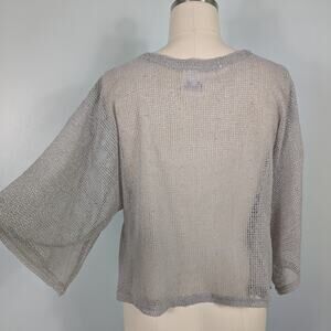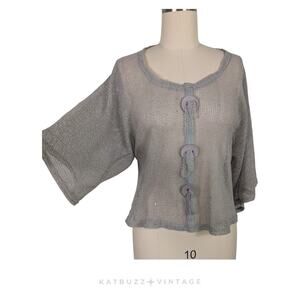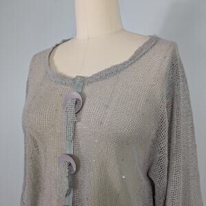 3/4 length sleeve open weave net artsy top from Noelle, size OS. Cotton mesh net with sequins and large buttons with tassels. Ideal for lagenlook, flowy, loose, artsy, beachy, neutral, eclectic, and loose vibes.