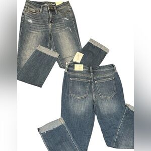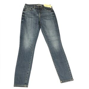 Hi rice, straight jeans, medium wash, distressed with a faded finish raw road caught the ankle