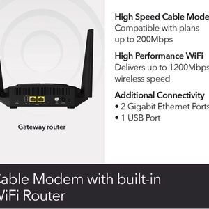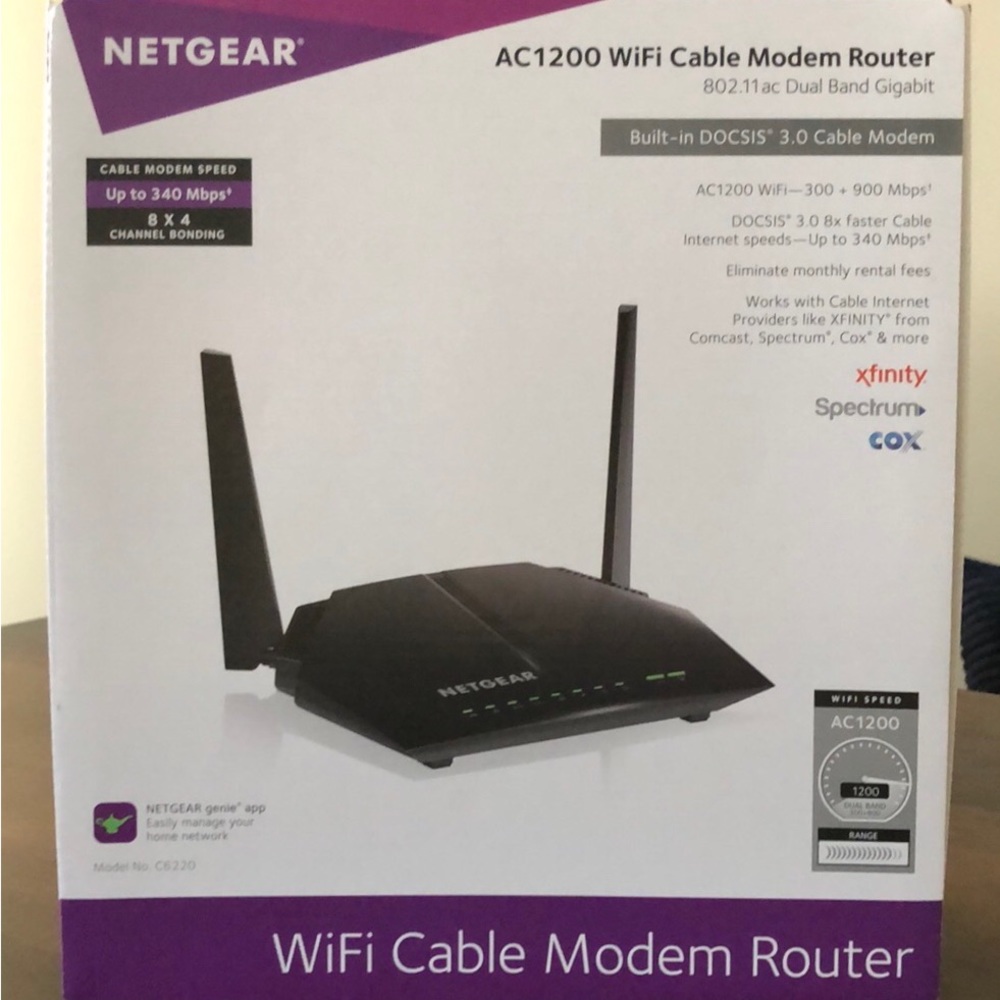 NetGear WiFi Cable Modem Router - works with Xfinity providers like Comcast, Spectrum, Cox & more. Up to 340 Mbps; DOCSIS 3.0 cable modem. Model C6220. Previously used with box.