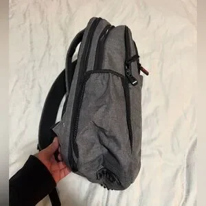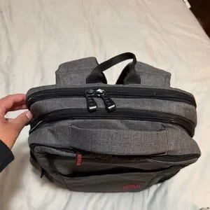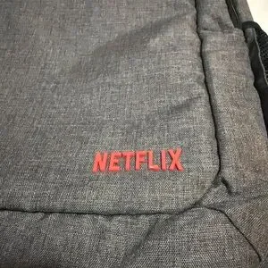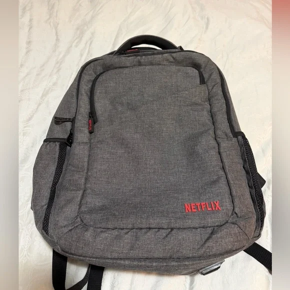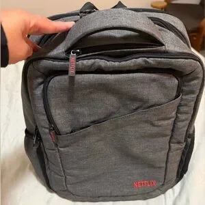 Lightweight gray backpack with the Netflix logo in red. It includes a padded laptop section, spacious front pocket, and mesh side pockets. Comfortable to wear and easy to carry for work, school, or travel. Good used condition with no major flaws.