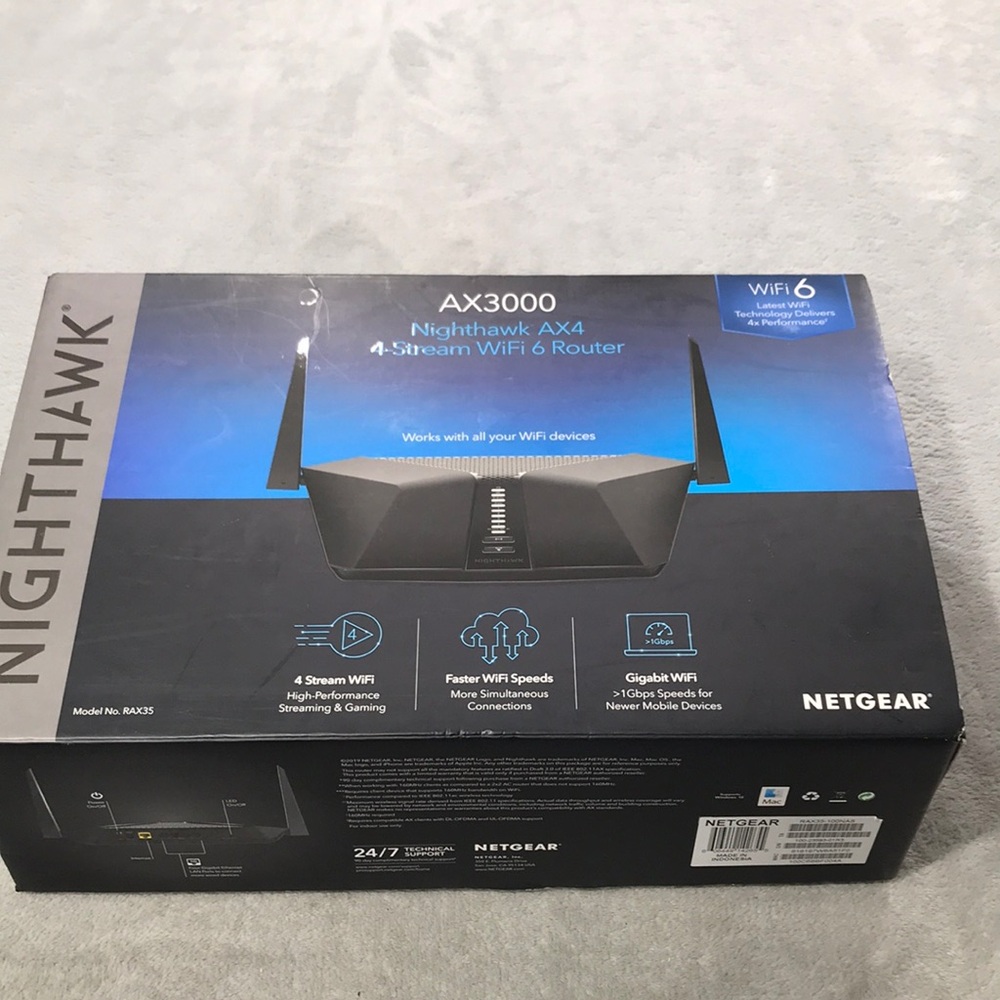 Super-fast WiFi—Up to 3Gbps (600Mbps + 2.4Gbps) † wireless speeds. The Nighthawk AX4 Router supports WiFi 6 (802.11ax), the latest generation of WiFi technology. Enjoy smoother streaming of 4K UHD content to smart TVs, mobile devices, and gaming consoles.