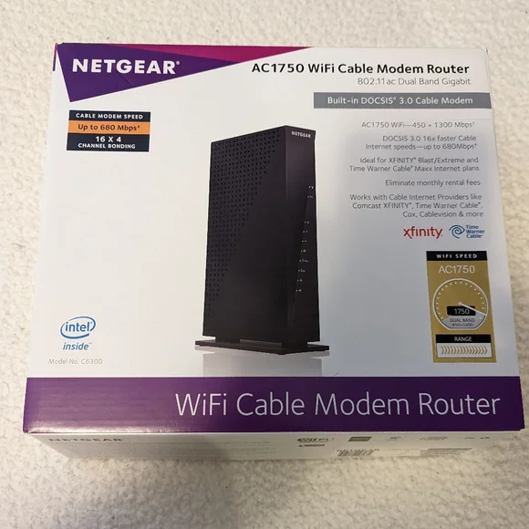 AC 1750 WiFi Cable Modem Router by Netgear. 802.11 ac Dual Band Gigabit. Built in DOCSIS 3.0 Cable Modem. See images of box for more information.