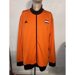 The product is a men's size XXL orange and black jacket featuring the official colors of the Netherlands national soccer team from the 2014 FIFA World Cup. This officially licensed Adidas jacket is perfect for fans of the team looking to show their support in style. Made in Vietnam, this jacket is a must-have for any Dutch soccer enthusiast.