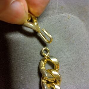 Nettie Rosenstein signed monkey necklace, green glass eyes, nice chunky chain with hook catch, in very good condition, has been worn but no damage or signs of wear. Signed on back, please see pictures. Chain is magnetic. Chain is approximately 22" long, monkey is 2 3/4" by 2 3/4". Wonderful necklace, and important maker. For some reason my camera picked up silver on the picture on the stand, it is definitely gold tone.