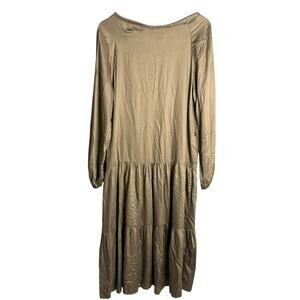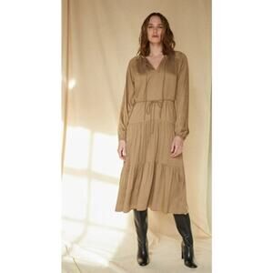 Neu Nomads Alka Dress in Khaki. Size XS / Extra Small. Features V-neck with tie, long blouson sleeves, tiered skirt, satin fabric, and midi length. Style NN-DR-614. 100% Modal. NWT / New with tags. Missing waist tie.