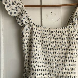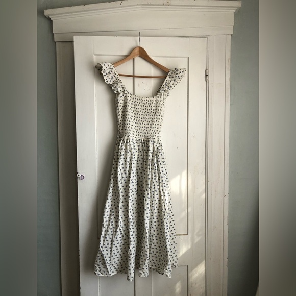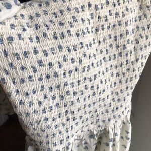 Like new condition - never worn, only tried on! washed once, unscented detergent. I’m not sure exactly what is happening in some of the photos, but I think the smocking is casting small shadows across the dress. It almost looks like stained. I tried to put it in the light to show there are no stains :)
