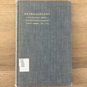 Rare vintage medical book Neurosurgery: An Historical Sketch by Gilbert Horrax, M.D., Sc.D. (1952, Charles C. Thomas Publisher). This historical reference explores the early evolution of neurosurgery with detailed images, including trephination and ancient surgical techniques. Hardcover in good vintage condition with minimal edge wear. A great collectible for neurology, surgery, or medical history enthusiasts.