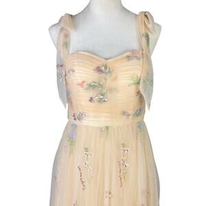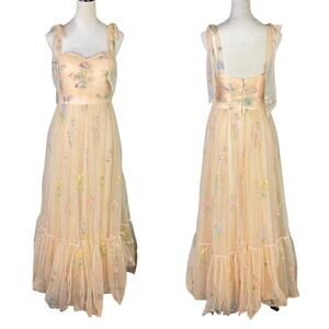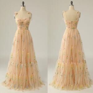 Neutral Cream Tulle Tie Straps Long A Line Flower Embroidered Prom Formal Dress