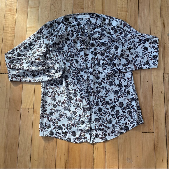 A chiffon button-up with two pockets, no collar, and a floral neutral (brown) pattern on a cream background. The brand is LOFT and the size is XS. Bust: 18”, Length: 25”, 5.3oz #floral #cream #neutral #lightacademia #buttonup