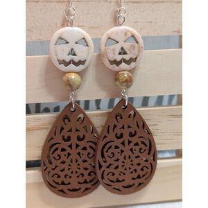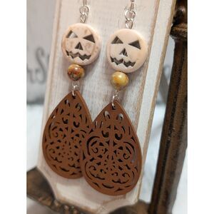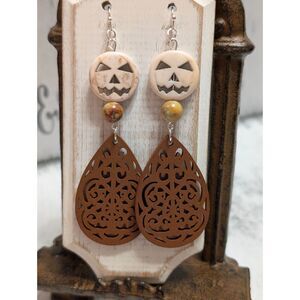 Neutral Jack-O'-Lantern and Brown Wood Filigree Earrings