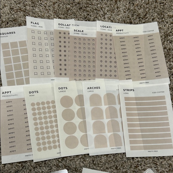 Set of neutral planner stickers. Includes various shapes and icons. Perfect for organizing and decorating planners.