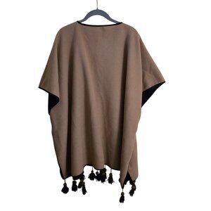 Neutral Reversible Cape Poncho Beige Black Faux Leather Trim Pom Pom One Size