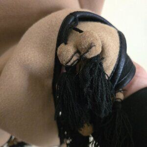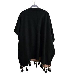 Elevate your wardrobe with this classic neutral reversible cape poncho. Featuring a chic beige and black design, faux leather trim, and pom pom accents. Designed with snap closures and sleeves for versatile styling. Ideal for any occasion.