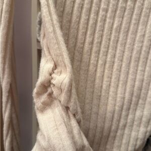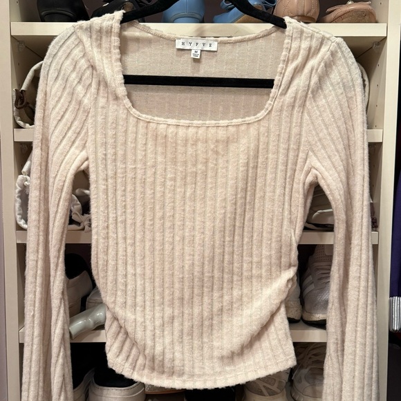 NWOT beige/champagne colored ribbed long sleeve top. Very soft and intentionally fuzzy looking. Square-ish neckline - unique and sexy! Ruching at the sides and long sleeves that widen at the bottoms. Fabulous neutral top!