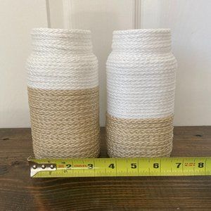 Set of two rope vases, wrapped in white and tan macramé cord. Put these vases on a shelf with some dried cotton or flowers for a simple and cozy look!