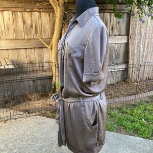 Apt.9 - Taupe champagne coloured satin finish boho romper with button up front, two pockets, two side / back pockets and sewn in wide tie sash for waist. A flattering color on all - Perfect for adding dressy to comfy. Size 14 in excellent condition. Approx 21 in pit to pit, 20 in waist and 38 inches in length from collar to hem. #playsuit #satin #dancingqueen