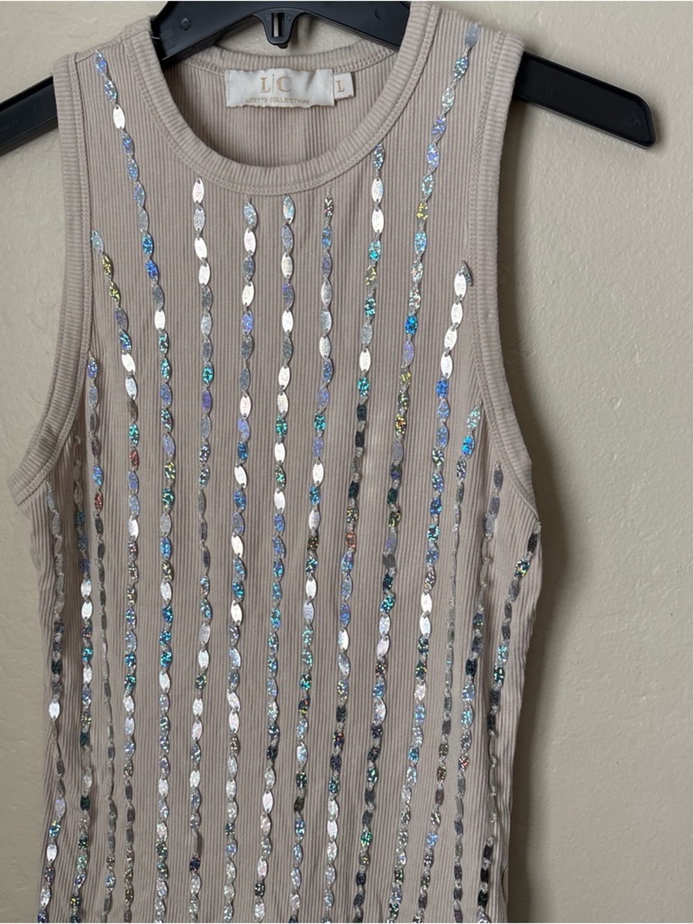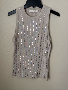sleeveless ribbed tank in a neutral beige tone with vertical sequin stripes. Lightweight, stretchy fabric for an easy, flattering fit. Dress up with a blazer or wear alone for a polished casual look.