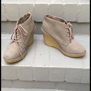 Worn maybe twice before I realized I couldn't squeeze into a size 6. Shoe is faux suede, Wedges are made of some cool rubber material.