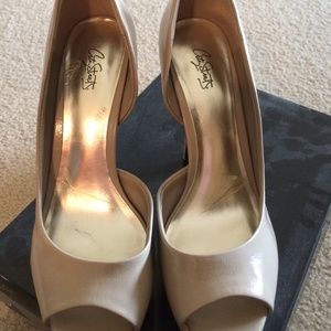 Neutral open toes pumps. Super comfy. Some signs if wear but overall good condition.