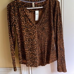 Anthropologie Pilcro split-neck top in neutral motif. 60% cotton/40% rayon. Machine wash. Length 21-22” (Scalloped hem), width from shoulder to shoulder 15”. Long sleeve, length approx 24.75”. XS. NWT