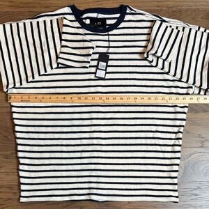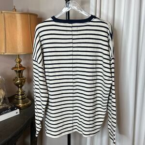 Keywords: Neuw, sample, long sleeve top, striped top, pullover top, crew neck, relaxed fit, casual top, black and white stripes, nautical, beach, vacation, comfortable top, easy wear