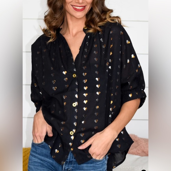 Stylish black button-down with gold heart details. Perfect for any occasion.