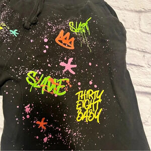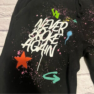 Eye-catching casual shorts featuring a bold graphic print. These black sweat shorts showcase the iconic "Never Broke Again" slogan alongside vibrant stars, crowns, and graffiti-style accents in various colors. The design offers a unique blend of streetwear edge and artistic flair, making them a standout piece for any wardrobe. Perfect for lounging at home, hitting the gym, or adding a pop of personality to your everyday outfits. These shorts are ideal for casual outings, sports activities, or relaxed weekends.