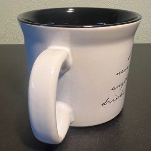 Chase your dreams and feel unstoppable with each sip you take from this oversized white ceramic Latte Da mug from Amici Home. This striking mug features a graphic of a black feather with black cursive text that reads, "never chase anything but drinks & dreams". (To "chase a drink" means to quickly consume a second drink after the first. The second drink is called a "chaser".) A stylish flared rim topped with a glossy onyx black ring and black interior complete the design. Microwave and dishwasher safe. Measures 3.75” tall with a 4.5” diameter; 5.75” across including handle. Holds 18 fluid oz.