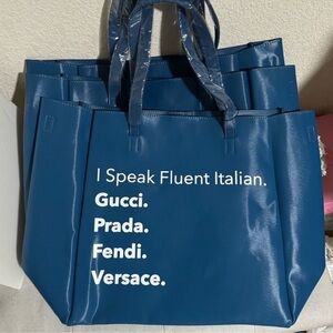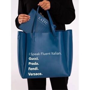 Never Full Tote Speak Fluent Italian Indigo Blue Gucci Prada Fendi Versace Bag