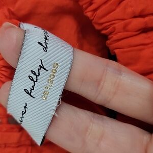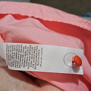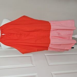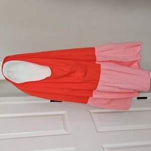 Never Fully Dress playful red and pink colorblock pattern, sleeveless design, halter neckline, and button closure. It is made of cotton fabric. This is a plus-size dress, but there is no size tag. Please refer to measurements.