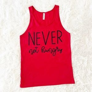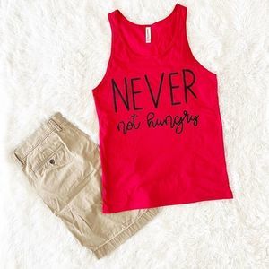 Super soft Bella + Canvas handmade graphic tank. Never Not Hungry text - true whether working out, awake, or just being a bro.
