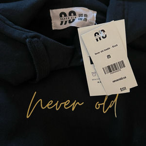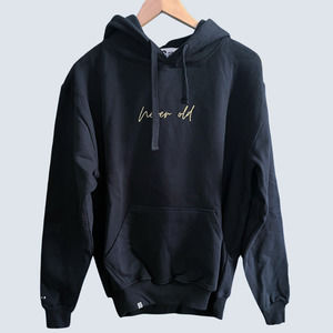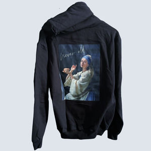 Never Old "Girl with Burger" graphic hoodie black sweatshirt. This hoodie features "Never Old" on the front and a graphic of a Girl with a Burger with "Never Old" written on the back. It has an adjustable drawstring hood, kangaroo pockets and cuffed wrists/elasticized waistband. This is a limited run by an Egyptian designer/brand.