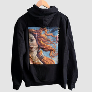 Never Old "Write Your Own Story" hoodie sweatshirt in black. This hoodie features "Write Your Own Story" on front & "Birth of Venus- Botticelli" graphic w/"Write Your Own Story" phrase on back. It has an adjustable drawstring hood, kangaroo pockets & cuffed wrists/elasticized waistband. This is a limited run by an Egyptian designer/brand.
