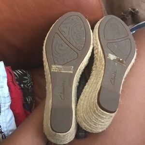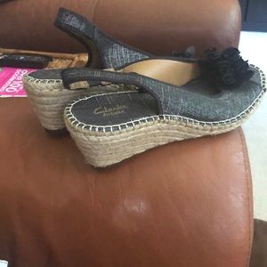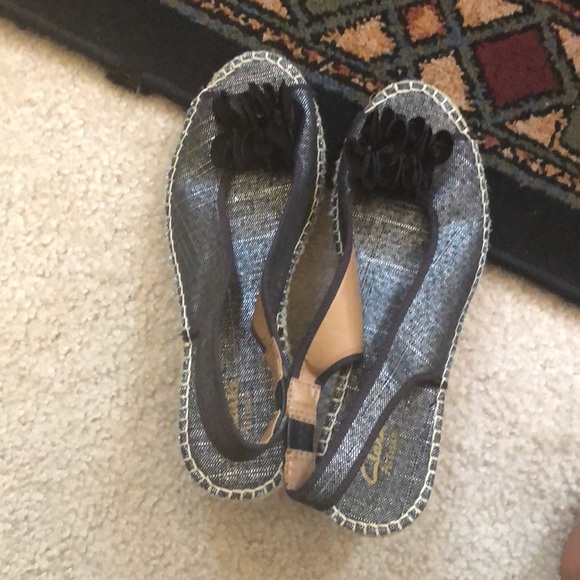 Never worn Clark’s. Silver/Gray shoe with a Black “flower” on toe
